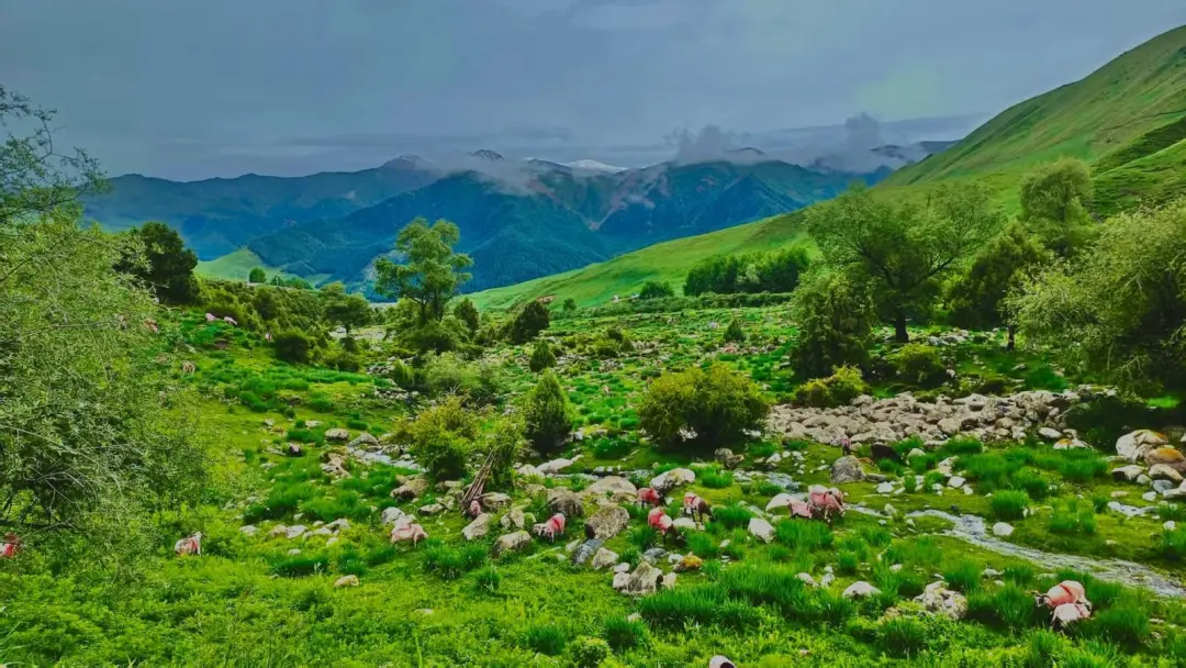 天祝毛藏的初秋,是大自然的调色盘。山峦由浓绿渐染斑斓,蓝天澄澈,云朵悠然。溪水潺潺,草甸野花与泛黄草叶相映,羊群点缀其间,每一处都满是温柔诗意。