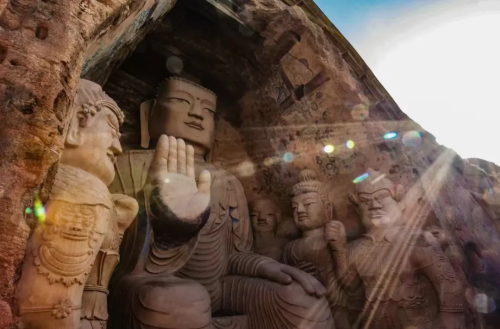 远远望去,石窟镶嵌在山体间,庄严而神秘。走进石窟,慈悲的佛像历经千年风雨,却依然散发着宁静祥和的气息。壁画上的色彩虽已斑驳,但线条勾勒出的身姿依然灵动,仿佛能从褪色的轮廓里听见远古回响;残留的朱砂与石绿,倔强地透露出画师落笔的虔诚,在时光的摩擦中,沉淀成一份穿越千年的厚重与庄严。