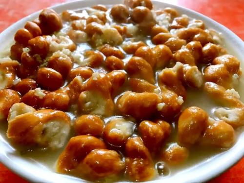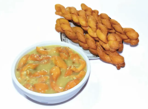 米汤用黄米慢熬,熬到米粒开花,汤汁浓稠,表面浮着一层薄薄的米油,香气醇厚。油馓子则是用发酵面团搓成细条,盘成麻花状,入油炸至金黄酥脆,咬一口咔嚓作响。吃时将馓子掰碎,泡在温热的米汤里,酥脆的馓子吸饱米汤,变得软中带脆,米香与油香交织,温热下肚,喉咙润了,胃也暖了。