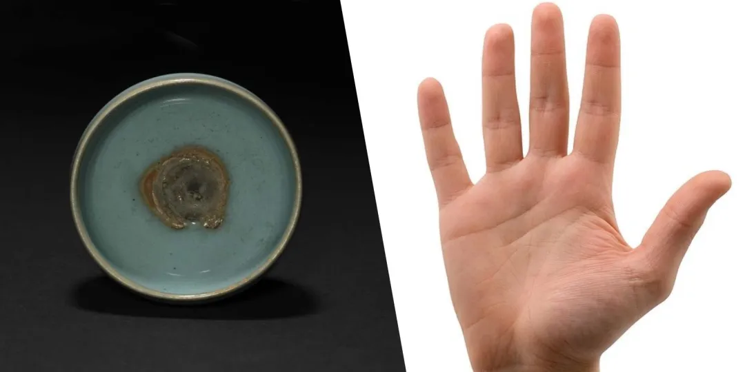 △月白釉钵与手掌大小对比示意图,平置可覆盖成年男子约半个手掌的面积