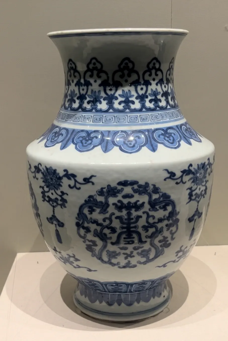 清代嘉庆年间的青花团龙寿纹尊,作为国家二级文物,承载着厚重历史。灰白色胎质、内外施白釉且外绘青花的独特工艺,口沿弦纹、颈部回纹与如意纹的细腻装饰,腹部团龙寿纹、如意牡丹纹的精美构图,还有足部弦纹,不仅是制瓷技艺的展现,更寄托事事顺心、平安如意、福寿安康的美好寓意,是研究清代陶瓷文化与民俗内涵的珍贵实物 。