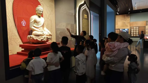 活动中,孩子们走进《天梯山石窟专题展》,近距离观赏北凉石塔,聆听它从异域传来、融入了中国特色的故事,以及石塔上佛像与古人心愿的秘密。继续前行欣赏唐代时期石窟壁画中伎乐天的灵动舞姿和胁侍菩萨像的柔美身姿,让孩子们直观感受了石窟艺术的艺术魅力,他们纷纷模仿菩萨的温婉姿态,沉浸在古韵之中。