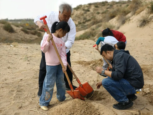 家庭游客更是这里的常客。许多家庭在展区驻足拍摄,父母手持仿制的老式草帽和铁锹道具,孩子模仿着展板上的压沙动作,快门声中定格下跨越时空的精神对话。在八步沙的生态实践区内家长带着孩子撸起袖子,在林场技术员指导下栽种柠条幼苗。新栽的苗株系着彩色心愿带随风轻摆,与远处起伏的草方格沙障遥相呼应。
