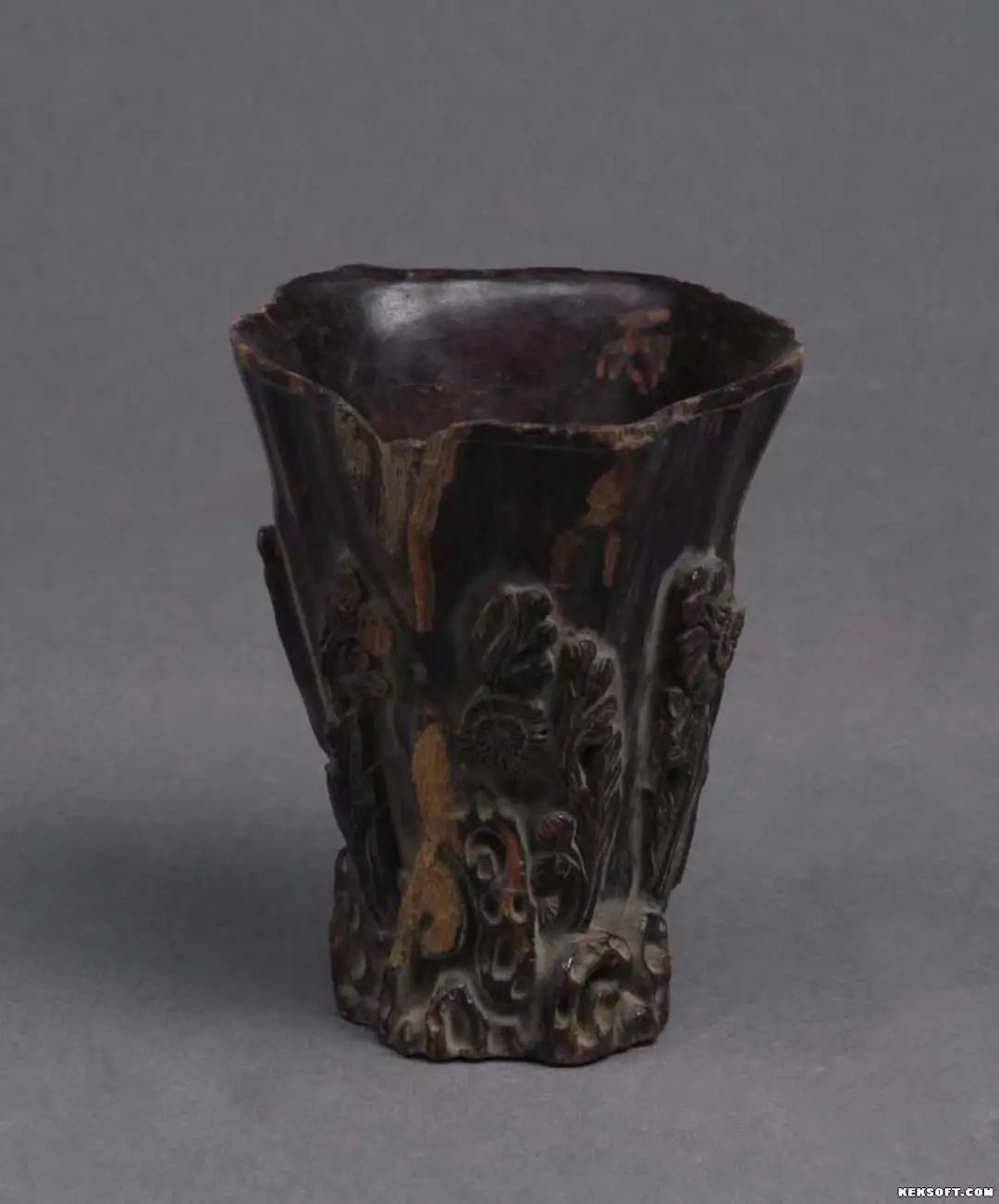 今天向大家分享的是沉香木酒杯。民国漆木器。整体呈喇叭状。口为不规则的圆形,深弧腹平底。杯内壁光滑,外壁浮雕山石、菊花图案。山石镂空,枝叶线条自然弯曲,菊花或怒放或含苞。雕刻精致、生动。内口沿朱书“丙”字。为国家三级文物。现藏于武威市博物馆。