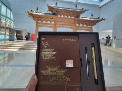 这款棂星门笔记本礼盒,将武威的地标性建筑化为封面独特的立体浮雕,每一次触摸仿佛都能感受历史的轮廓。内页平滑易书写,搭配专门调校的金色笔具,出墨流畅,配重舒适;连同替换芯,为您备好不间断的创作体验。