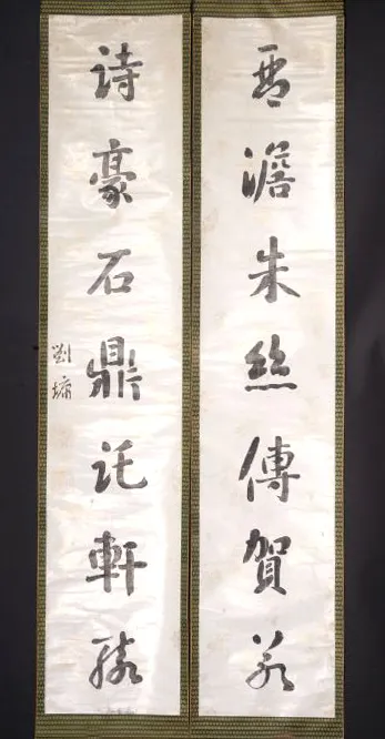 从艺术造诣上来说,这幅行书七言联墨色浓厚如漆,饱满莹润,为刘墉书法最具标志性的特点,给人以雍容华贵、沉稳庄重之感。结字貌丰骨劲,内部结构严谨,重心安稳,笔画向内凝聚,蕴含着一股含蓄而强大的力量。布局疏朗,字距与行距开阔,与浓重的墨色形成疏密对比,使得整体效果大气磅礴而不显窒闷。完美展现了刘墉书法用墨厚重、结字内敛、气息古朴的典型风格,是其代表书风的一次精彩呈现。