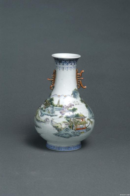 大家好,今天为大家分享的是民国瓷器,仿乾隆双耳五彩瓷瓶。白胎白釉,五彩,高颈,溜肩,圆腹,圈足,颈部两侧各有半个寿字形耳,外口沿下绘一圈青花凤尾纹,腹绘山水景物图,画面有花鸟、人物、山石、栏杆、小桥、流水,画面配色雅致,画工精细。圈足外绘一圈青花回纹,底为蓝色三行篆书“大清乾隆年制”题款。为国家三级文物,现馆藏于武威市博物馆。