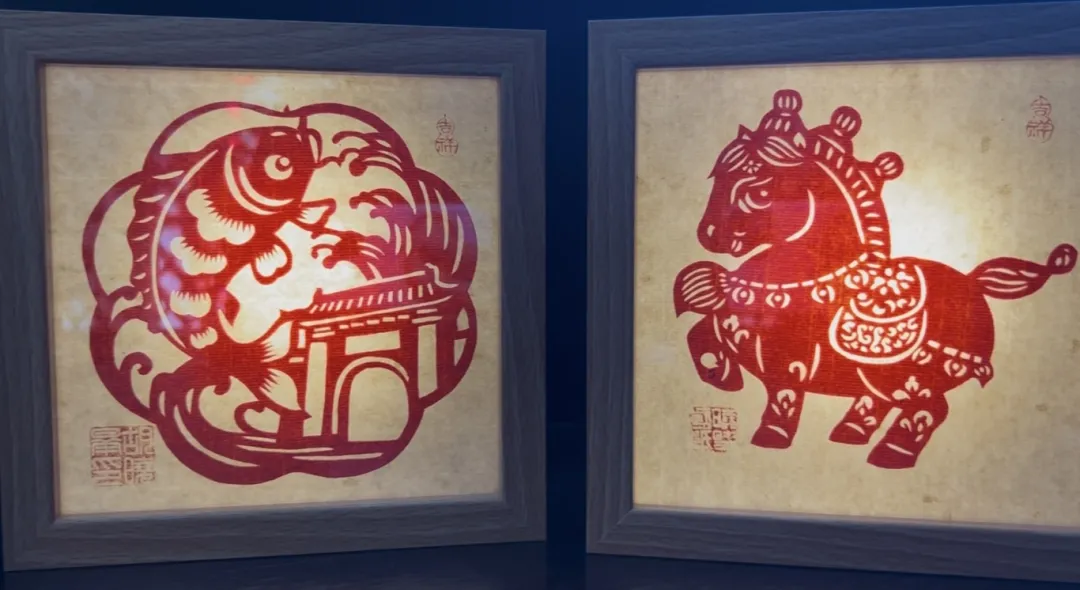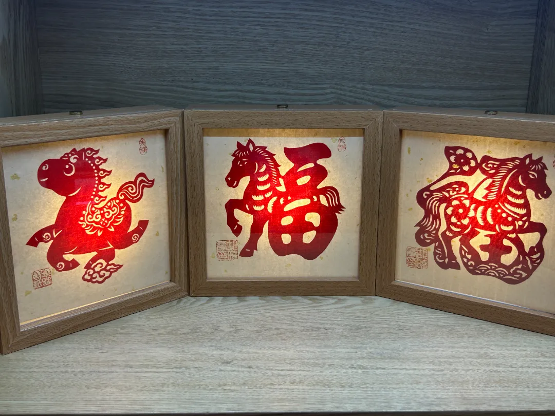 小夜灯的底色,是古浪剪纸最具代表性的正红,搭配干净的纯白,延续了剪纸“线线相连、虚实相生”的老技法。粗犷的轮廓线配上细腻的镂空小细节,没有多余的修饰,却藏着西北民间艺术的质朴感。而且还紧扣2026丙午马年,把“福”字和奔跃的骏马巧妙融合,再加上太阳纹、回纹这些吉祥小纹样,既呼应了武威“凉州大马,横行天下”的特色,也藏着马到成功、福气满满的小期许。