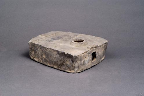 大家好,今天向您分享的是汉代灰陶灶,灰陶质,灶面呈不规则方形,前有门,方形,门上方的灶面上有隔墙,“凸”形。后有烟道。灶面有圆形灶口,灶口上置釜,与灶身一体。灶面饰秤钩、叉等饰物。为国家三级文物,现馆藏于武威市博物馆。