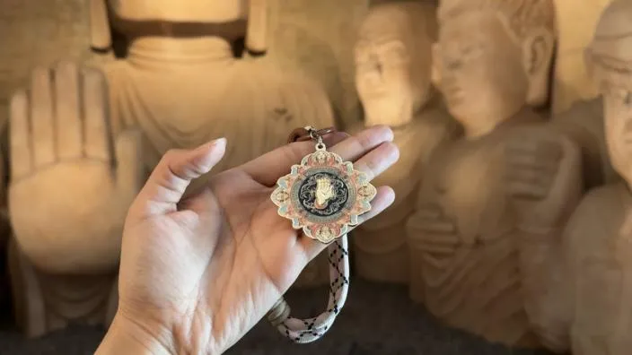 这款佛手文创正是对这一时期文化脉络的现代转化,中央鎏金佛手源自天梯山石窟佛造像的无畏印,是五凉时期佛教艺术的典型符号象征,佛陀为众生拔除恐惧、赐予勇气的大慈心愿,也呼应了五凉政权在乱世中守护文脉、安定一方的精神。采用珐琅彩与鎏金工艺,体现金属造像的精致质感,包装“开运辟邪”传递“随身祈福、平安顺遂”的美好祝愿,是武威五凉文化的活态载体,每一处细节都在诉说凉州的故事,是送给自己与亲友的最好祝福。