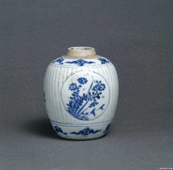 青花开光瓜棱瓷罐