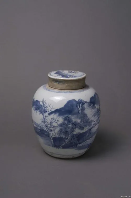 清康熙青花垂钓图瓷罐